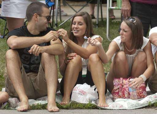 Frank Fiore, left, of Mundelein, Megan Brown of Chicago and Kayla Akers of Indiana discuss which candy to take during Sunday's Community Days parade in Mundelein.