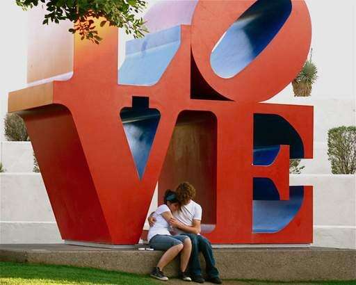Two young lovers sit near a sculpture which states the obvious in Scottsdale, Arizona in March 2009. Soledad Jameson of Mount Prospect
