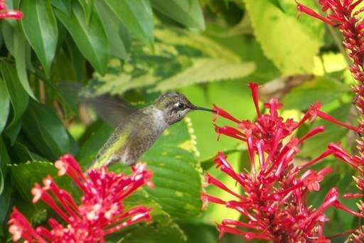 A hummingbird flies from flower to flower at the San Diego Zoo. Colleen O'Rourke of Island Lake