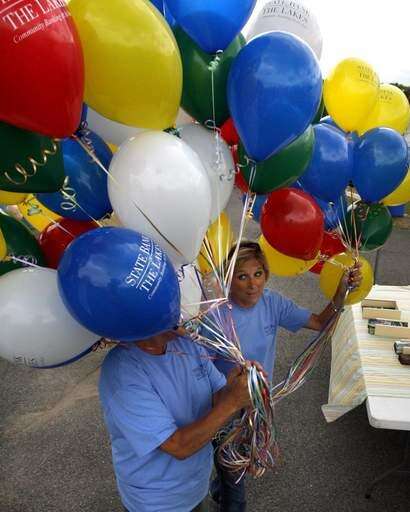 Betty West, left, and Sandy Duehery, with State Bank of Lakes, bring balloons to the bank's booth on Saturday for at Antioch's Taste of Summer Festival.