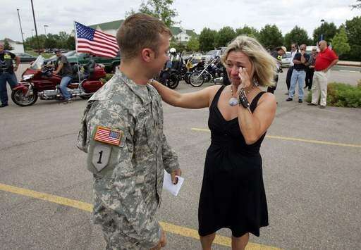 Army Sgt. Thomas Horvath greets well-wishers Friday in St. Charles. He received an escort to his home by the Patriot Guard Riders. Brian Hill | Staff Photographer