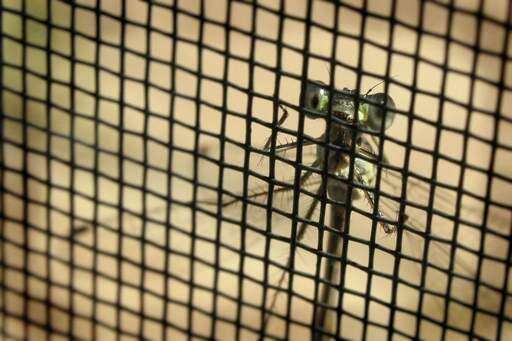 A damselfly lands on a patio door screen during a summer day.