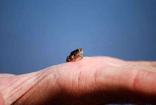 This photo shows a very young toad sitting on the palm of my Dad's hand. This picture was taken by a swamp so there were hundreds of these little guys jumping around.