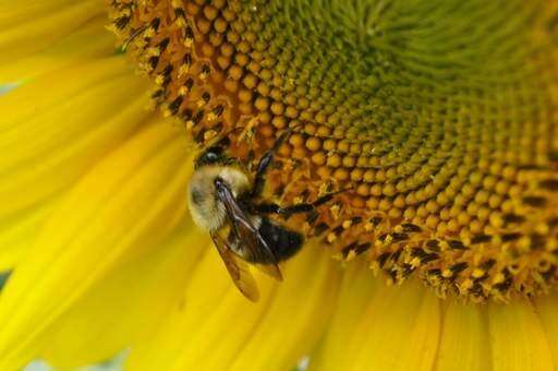 While in Springfield on vacation I saw a bumble bee sitting on a sunflower. The sunflower was in a big garden in the backyard of a relative's house.