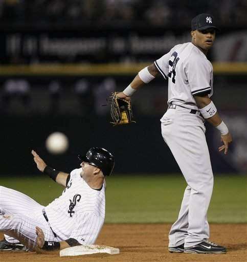 New York Yankees second baseman Robinson Cano, right, watches his throw to first go wide, allowing Chicago White Sox's Jim Thome to score after Cano forced A.J. Pierzynski at second during the seventh inning. Associated Press