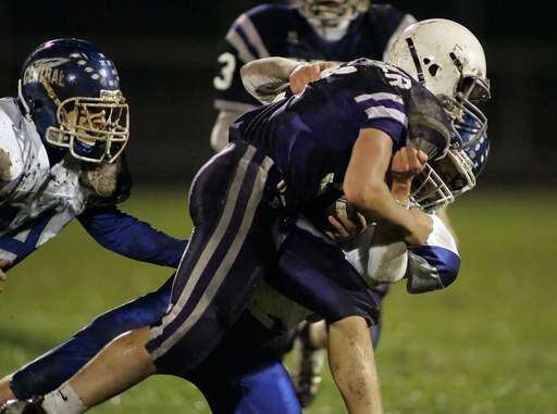 WEEK 8- Burlington Central's Tim Maroder, (4) tries to break thru Hampshire's Mike Kuefner, (31) and Ryan DeChant, (67) at Hampshire on Friday, October 16th, 2009.