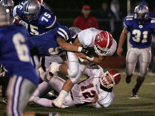 PLAYOFFS - ROUND 2: Jarrett Wood of Vernon Hills is pulled down by a Glenbard South defender during the Vernon Hills at Glenbard South football game Saturday.