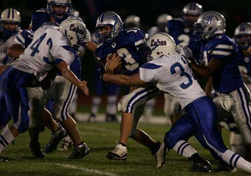 WEEK 4- Lakes' running back Andrew Tubek fights off the tackle of Vernon Hills linebacker Austin Miller during the high school football game between Lakes at Vernon Hills Thursday in Vernon Hills.