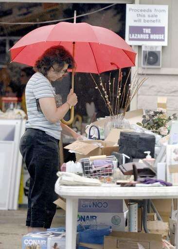 Sales slowed Friday as a morning drizzle fell atop tarps covering furniture and tables of books and toys.