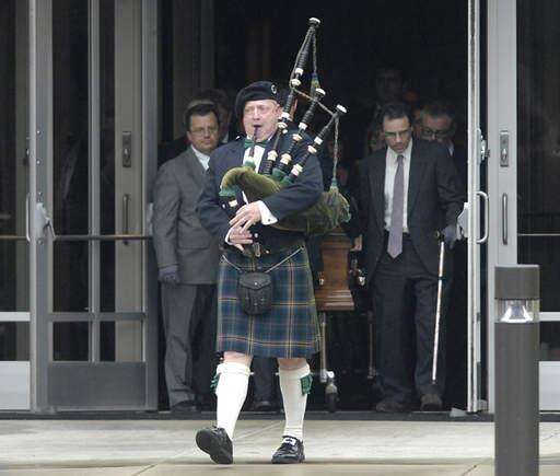 A bagpiper leads pallbearers out the front doors of St. Peter Catholic Church in Geneva after the funeral of Martin Jordan at on Friday. Laura Stoecker | Staff Photographer