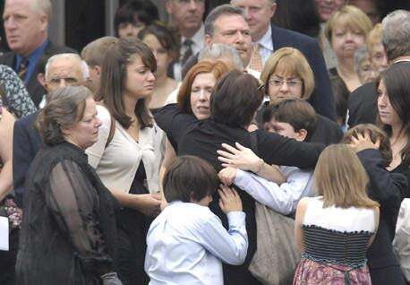 Family and friends console each other after the funeral of Martin Jordan at St. Peter Catholic Church in Geneva on Friday. Laura Stoecker | Staff Photographer