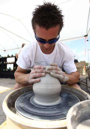 Artist Shawn Barbagallo of Rockford throws some clay on the potter's wheel at Batavia's fifth annual Art in Your Eye festival held in downtown Batavia on Sunday.
