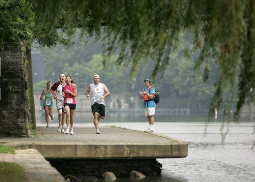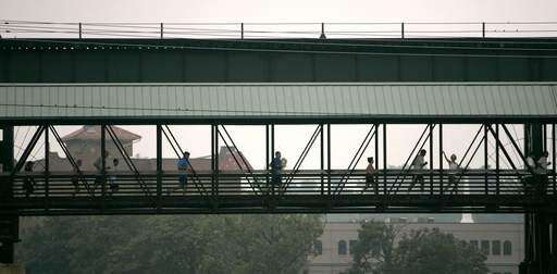 Runners cross a bridge over the Fox River in St. Charles during the Bob Leonard 5K Run on Saturday morning.