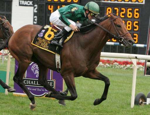 Gio Ponti with jockey Ramon Dominquez crosses the finish line and wins the 27th Arlington Million at Arlington Park on Saturday. The trainer of Gio Ponti from Castleton Lyons Farm in Lexington, Kentucky is Christophe Clement.