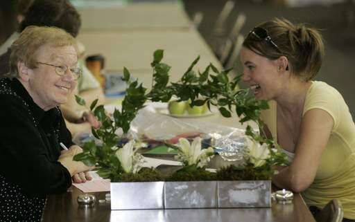 Hannah Rinn, 19 of Huntley shares a laugh with floriculture judge Pat Blaul of Crystal Lake Tuesday at the McHenry County Fairgrounds in Woodstock. Rinn's entry was made mostly of lilies, star of bethlehem flowers and Italian ruscus.