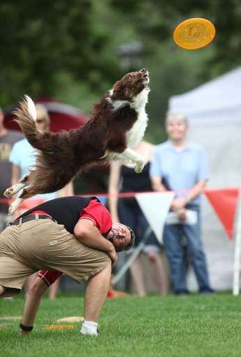 Ed Jakubowski of Connecticut makes Roony leap off his back to catch a flying Frisbee at Dog Days in Cantigny Park in Wheaton on Saturday.