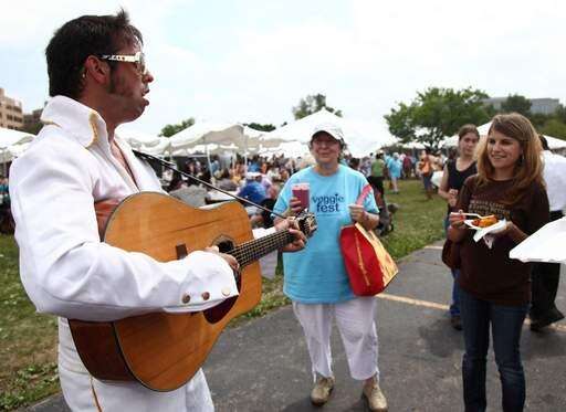 Elvis impersonator Mike Schulbaum of Indianapolis plays his guitar to entertain others at Veggie Fest in Naperville on Saturday.