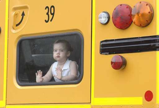 Nora Doherty, 2, of St. Charles checks out the view from the back of a school bus at St. Charles Park District's "Big Truck Show" at Langum Park on Saturday morning, August 8. The bus was provided by St. Charles School District 303.