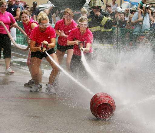 Ashley Ovaska, left, and Jennifer Robinson lead the Kindercare team against the Great American Tire team during the fireman's water fights on the last day of the Lake Villa Days Sunday at Lehmann Park in Lake Villa.