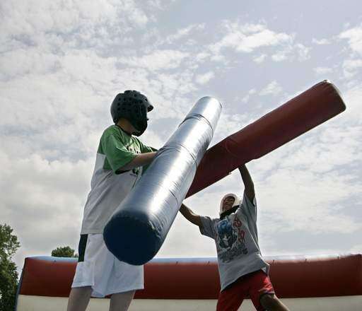 Kyle Fitzpatrick, 13, from Poplar Grove knocks Sean Cardenas, 9, from Rockford off his stand during a game at Carpentersville's National Night Out event on Saturday afternoon.