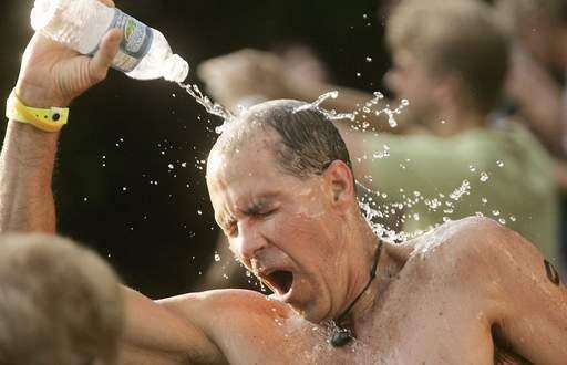 Dick Davis, of Holland, Michigan try to cool down at the finish line Sunday during Naperville Sprint Triathlon at Centennial Beach in Naperville.