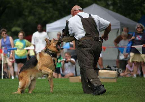 Retired police dog Bravo shows his attack skills on police dog trainer Alex Rothacker in front of hundreds of dog lovers at Dog Days in Cantigny Park in Wheaton on Saturday.