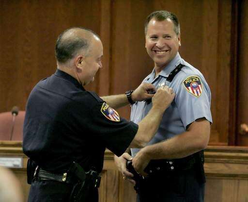 Auxiliary officer Curtis Kiebles, right, is all smiles as receives a Police Star from Wheaton Deputy Chief of Police Thomas Meloni at Wheaton City Hall Monday. Officer Kiebles helped apprehend and detain a suspect after a stabbing on East Crescent.