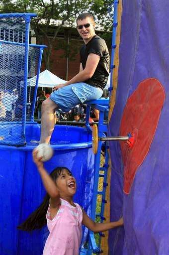 Adalis Ortega, 5 of Mundelein gets real close as she prepares to dunk Mundelein police officer Tony Raciak during the Mundelein Police Department's annual community picnic on the grounds of Santa Maria Del Popolo School.
