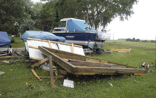 Most of Frank Hudkins' shed, picked up and thrown by a suspected tornado Wednesday night, luckily landed just next to his three boats in his back yard. Only the rear of one of boats had debris resting on it. Laura Stoecker | Staff Photographer