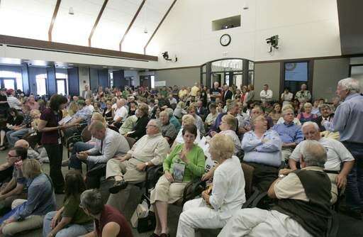 People flow on to Sigwalt St. in front of the Arlington Heights Village Hall as US Rep. Mark Kirk conducted a town hall meeting to discuss health care reform.