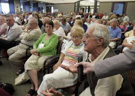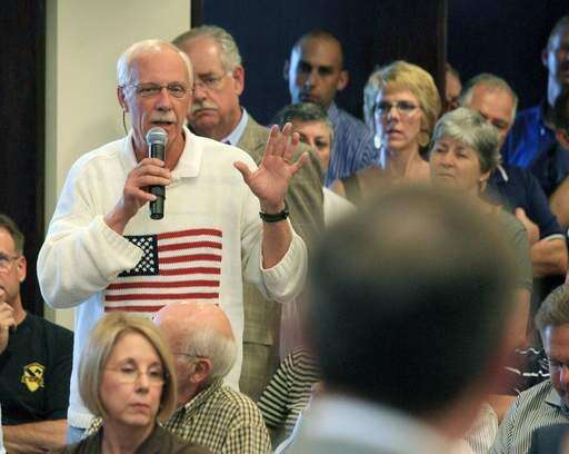 Ed Smith of Inverness asks a question as US Rep. Mark Kirk conducts a town hall meeting to discuss health care reform at the Arlington Heights Village Hall Monday afternoon.