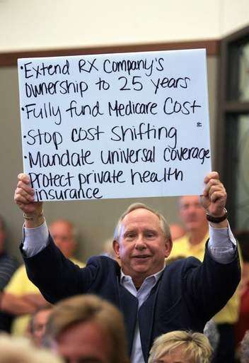 Alan Kampe of Libertyville expresses his opinoins with a sign as US Rep. Mark Kirk conducts a town hall meeting to discuss health care reform.