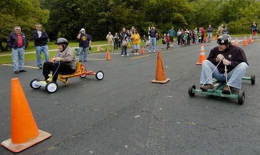 Streaking down the course are Mayors Jeff Schielke of Batavia, left, and Kevin Burns of Geneva, marking the start of the annual Fox Valley Cubmobile at LeRoy Oakes Forest Preserve in St. Charles. Bob Chwedyk | Staff Photographer
