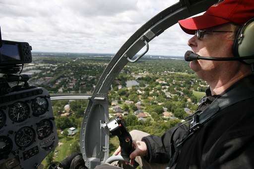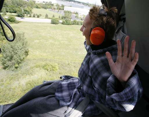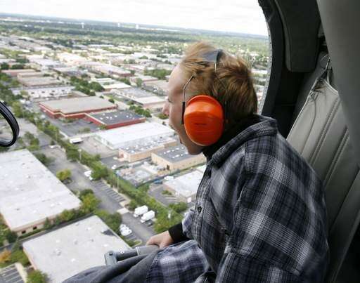 Matthew Mainan, 11, of Wheaton, gets a bird's eye view of the Schaumburg area on Saturday from a 1968 U.S. Army helicopter OH-6A that saw action in Vietnam and was reconditioned in 2001. The helicopter rides from the Schaumburg Regional Airport were part of Mayor Al Larson's Aviation Celebration to raise money for the Woodfield Area Children's Organization. The restored helicopter is now owned by AM Air Service fleet that provides Chicagoland helicopter rides and excursions. The event continues from 10 a.m. to 4 p.m. today at the airport, 905 W. Irving Park Road. Admission is $8, free for children 5 and under. To see a video from the event, see www.dailyherald.com. George LeClaire | Staff Photographer