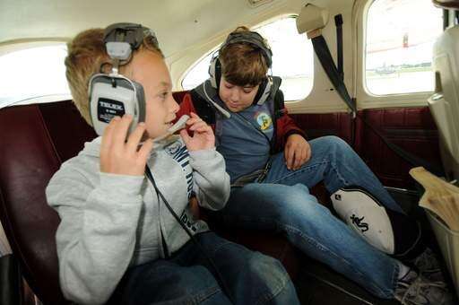 Kris Young, 8, and Karl Lingner, 13, both of Mount Prospect, get ready for takeoff for a 20-minute flight on Saturday during an open house at the Chicago Executive Airport in Wheeling. Joe Lewnard | Staff Photographer