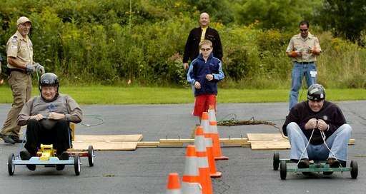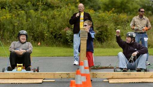 Starter Corey Knopp of Cub Scout Pack 112 of Batavia, center, gets ready to launch Mayors Jeff Schielke of Batavia, left, and Kevin Burns of Geneva, down the course marking the start of the annual Fox Valley Cubmobile at LeRoy Oakes Forest Preserve in St. Charles. Schielke took the prize this year beating Burns, a two-time winner. Bob Chwedyk | Staff Photographer