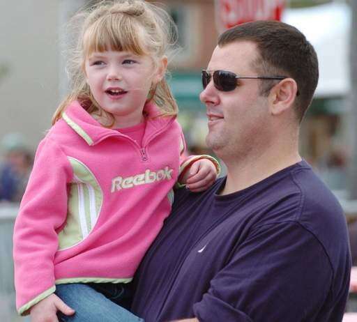 Hannah Glazbrook, 4, of Lake Zurich "dances" with her dad, James, as they listen to the music act during the Downtown Palatine Street Fest Saturday. Joe Lewnard | Staff Photographer