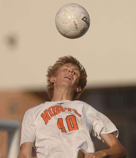 Max Auden of Naperville North,left, and Pat Kaindl of Neuqua go up for a header during the Neuqua Valley at Naperville North boys soccer game Tuesday.