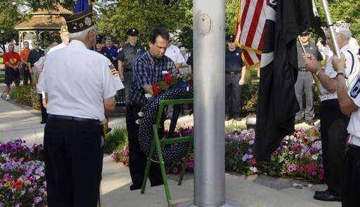 Itasca Mayor Jeff Pruyn, center, places a wreath as the Itasca VFW hosts a 9/11 memorial service in Usher Park in downtown Itasca. Scott Sanders | Staff Photographer