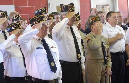 Veterans, firefighters and police personnel say the Pledge of Allegiance at the 9/11 memorial ceremony Friday in Mount Prospect. Bill Zars | Staff Photographer