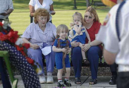 Two-year-old Brian Pigott, center, watches the ceremony as his Grandmother Alice Beine, left, sister Bonnie Pigott, and his mother Cheryl Pigott look on. The Itasca VFW hosts a 9/11 memorial service in Usher Park in downtown Itasca. Scott Sanders | Staff Photographer