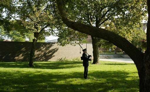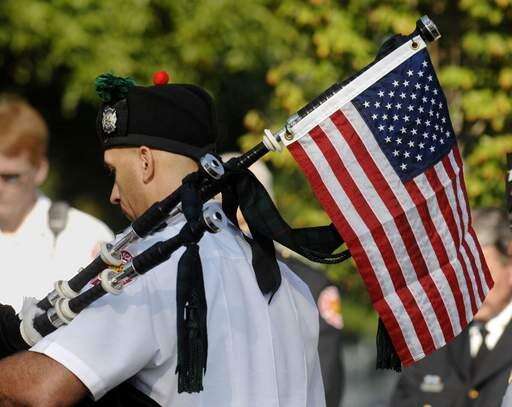 Elgin police officer Jim Lalley plays Amazing Grace on the bagpipes during the City of Elgin's Sept. 11th memorial service Friday. Christopher Hankins | Staff Photographer