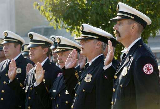 Palatine Deputy Fire Chief Scott Andersen, far right, reaffirms oath along with other firefighters during Patriot Day Ceremony at the Palatine Firefighters Memorial. Bob Chwedyk | Staff Photographer