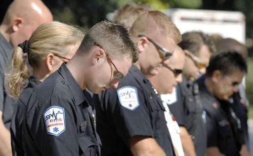 Elburn firefighter/EMT Brad Reese and fellow firefighters bow their heads in prayer while Chaplin John Dumke recites a prayer during the 9/11 memorial gathering in Elburn Friday. Laura Stoecker | Staff Photographer