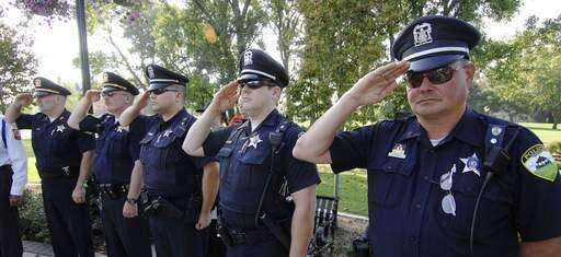 The Itasca VFW hosts a 9/11 memorial service in Usher Park in downtown Itasca. Members of the Itasca Fire Department and Itasca Police Department attended along with a small group of citizens Friday. Scott Sanders | Staff Photographer