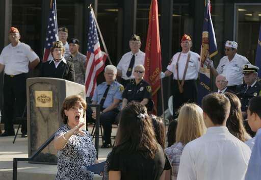 Choir director Cindy Hall directs her students from the Northwest Baptist Academy as they perform as part of the Sept. 11 ceremony Friday morning in Elgin. Christopher Hankins | Staff Photographer