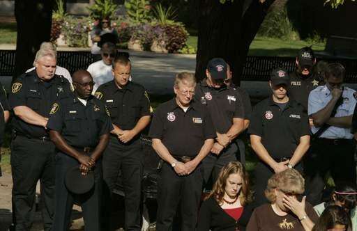 Members of Elgin's police and fire departments, along with attendees of Friday's Sept. 11 service, bow their heads during the ceremony to honor those who lost their lives during the terror attacks eight years ago. Christopher Hankins | Staff Photographer