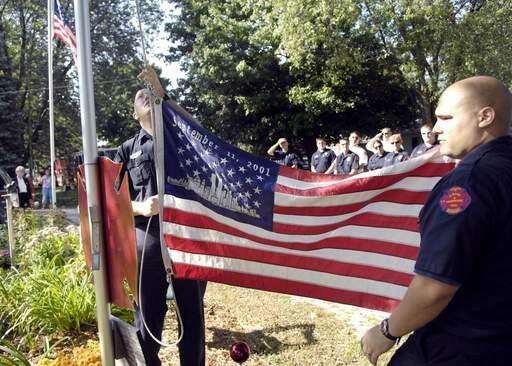 Elburn firefighter/EMTs Sam Barisich, left, and Chris Garon raise the second of two special 9/11 flags at Paul Wdowicki's front yard garden memorial on Friday, September 11. Laura Stoecker | Staff Photographer