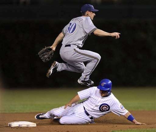 There was more. In the seventh, former Cub Casey McGehee led off with a single. With the infield shifted to the right, Prince Fielder grounded one to the right of second base. Shortstop Ryan Theriot grabbed it and flipped to third baseman Aramis Ramirez covering second. Ramirez threw a little wide of first baseman Derrek Lee, who finished the 6-5-3 double play.