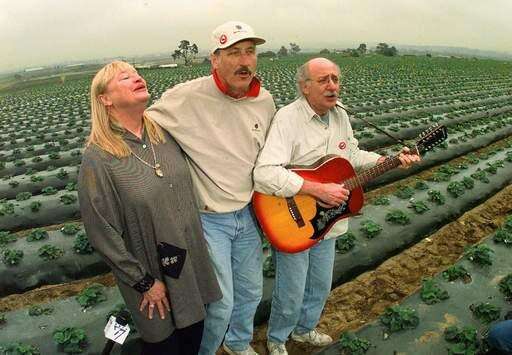 Noel Paul Stookey, center, Mary Travers, left, and Peter Yarrow, right, of the folk singing group, Peter, Paul & Mary, sing in a strawberry field in Watsonville, Calif., Thursday, March 19, 1998. Associated Press